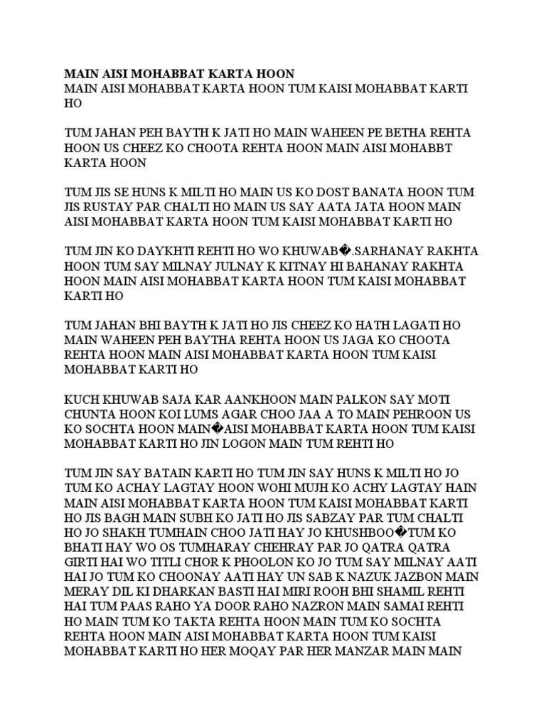 Main Aisi Mohabbat Karta Hoon - Tum jab bhi ghar par aatay ho aur sab say batain kartay ho main aut say parday ki janan bus tum ko dekhti rehti hoon ik tum ko dekhnay ki khatir main kitni pagal hoti hoon main aisi mohabat karti hoon tum kaisi mohabbat kartay ho jab darwazay par dastak ho ya ghanti phone ki bajti ho main chor k.